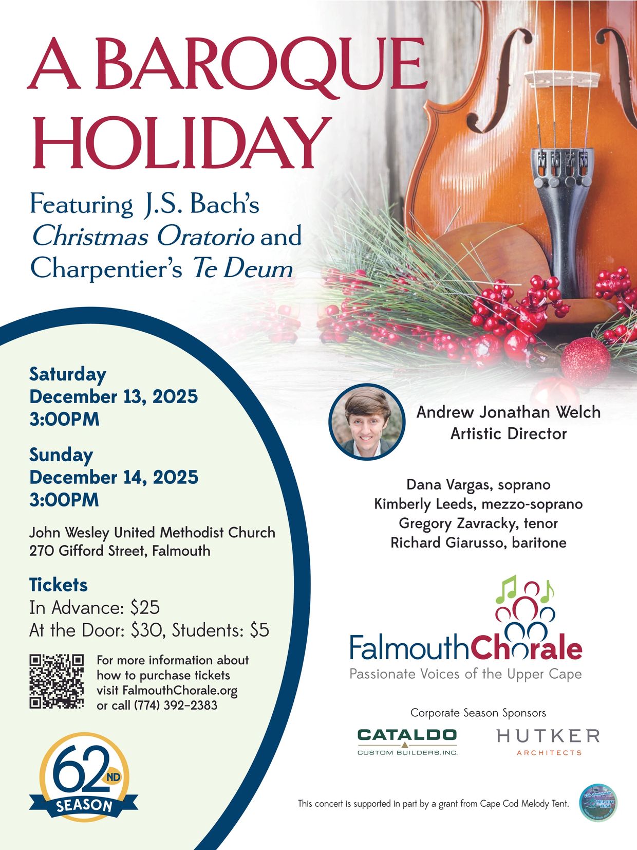 The Falmouth Chorale’s 62nd season will feature four Chorale concerts led by our new Artistic Director Andrew Jonathan Welch, as well as concerts featuring the Falmouth Chorale Chamber Singers. Please check our Events page for updates to our concert programs. We are excited to see you all again soon!